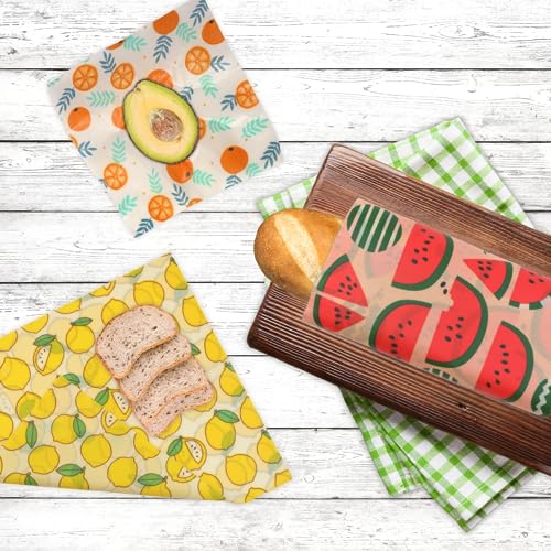 【NATURAL ECO-FRIENDLY INGREDIENTS】: Our Reusable Beeswax Wrap are made from Organic cotton, Organic jojoba oil, Natural Harvest beeswax, and Tree resin. These beeswax wraps are all certified with European LFGB, the fabric is GOTS certified(Global Organic Textile Standard) and the packaging is made from 100% recycled paper. Reusable beeswax food wrap is sustainable and a natural alternative to plastic wraps and cling film for food!