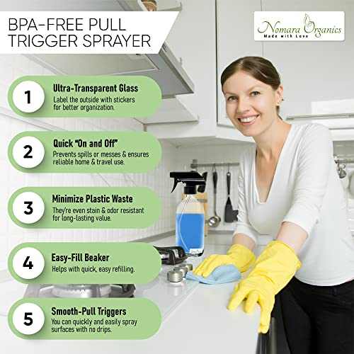 Nomara Organics Made with Love is an established brand that strives to deliver smart and innovative home and garden products to make your life easier and more comfortable every day. Our products are designed with high quality, safe and durable materials, under strict supervision and adhering to the highest manufacturing standards. Not completely satisfied with your purchase? Our customer care department has you covered! Practical and functional clear spray bottles for cleaning, gardening, personal care products Combining durability with functionality, these spray bottles will become an essential tool in any well-organized household. Made from high quality clear glass, with an optimal capacity of 500ml and a practical, easy to use pump trigger. This glass bottle with lid is practical for a variety of cleaning or gardening activities. At the same time, it is useful for hair salons, beauty salons, spas. Not convinced yet? Here are some of the amazing features of these empty spray bottles: Set includes: 3 x 500ml spray bottles with pump trigger, leak-proof caps. Material: BPA free 100% safe tough clear glass, durable. Convenient capacity for everything from cleaning solutions, essential oils, beauty products, hair products, aromatherapy oils and more. Ideal for gardening, plant watering, refreshing flowers, arts and crafts, ironing. Refillable and environmentally friendly, minimizes plastic waste. Easy to use, ergonomic pump. Modern and elegant, ideal for the kitchen or bathroom. Safe liquid storage, protects against oxidation; Thoughtful gift idea for housewarming, DIY enthusiasts, plant lovers. You will immediately fall in love with these practical and eco-friendly glass spray bottles